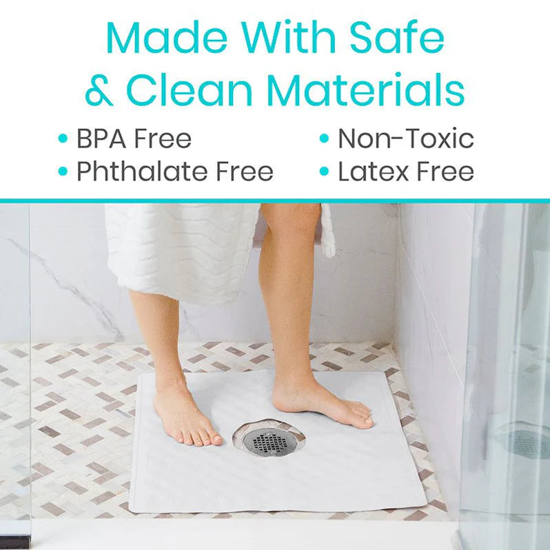 The shower mat is constructed from thick latex-free rubber that has been treated with an antibacterial agent.