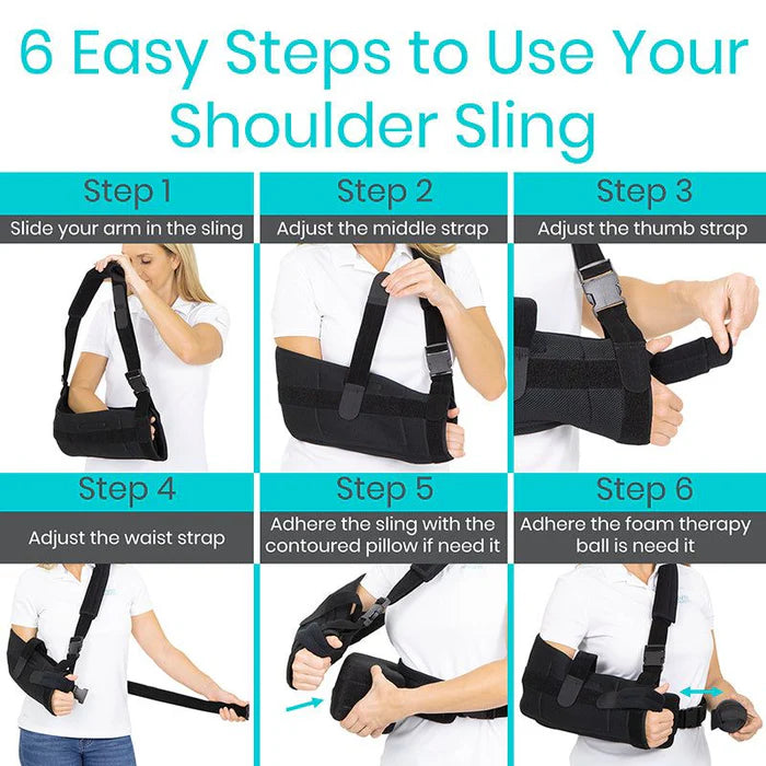 Slide the affected forearm into the sling, then attach the quick release strap. Adjust the length of the strap until the arm feels comfortable and supported. Attach closure strap to secure the elbow in place. Position the abduction pillow beneath the arm sling and secure with the adjustable waist strap.