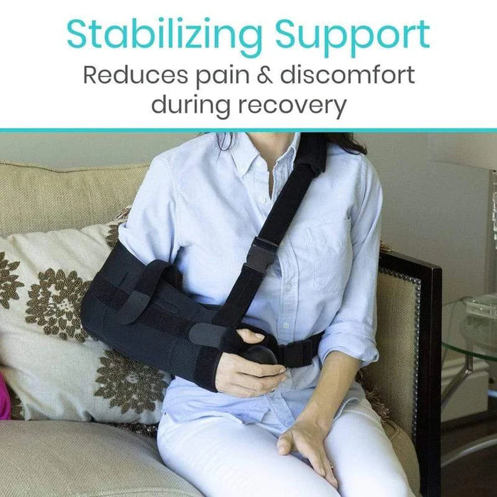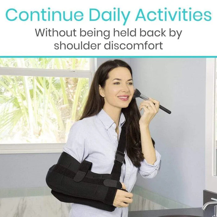 Versatile abduction sling can be worn on the left or right arm and includes integrated thumb loops to reduce fatigue