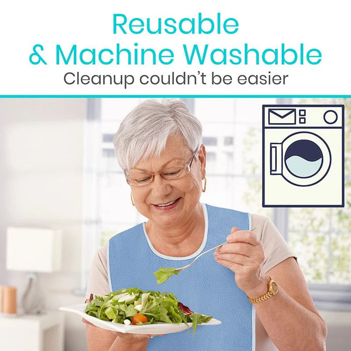 These large bibs are great for those suffering from hand tremors, Parkinson’s, ALS and limited range of motion in the hands or wrists. These bibs are also great for protecting clothing while feeding others, applying makeup and participating in artistic endeavors.