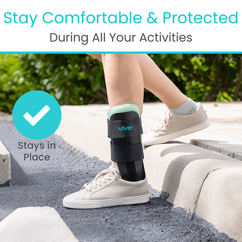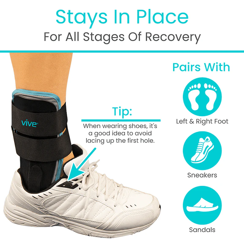 The Vive Air & Gel Ankle Stirrup provides maximum stability and support for various ankle injuries, including sprained ankles, peroneal tendonitis pain, Achilles pain, sports injuries, and general ankle discomfort. It features two rigid exterior shells that minimize ankle rotation, preventing inversion or eversion of the ankle. This stabilization helps promote a faster recovery.