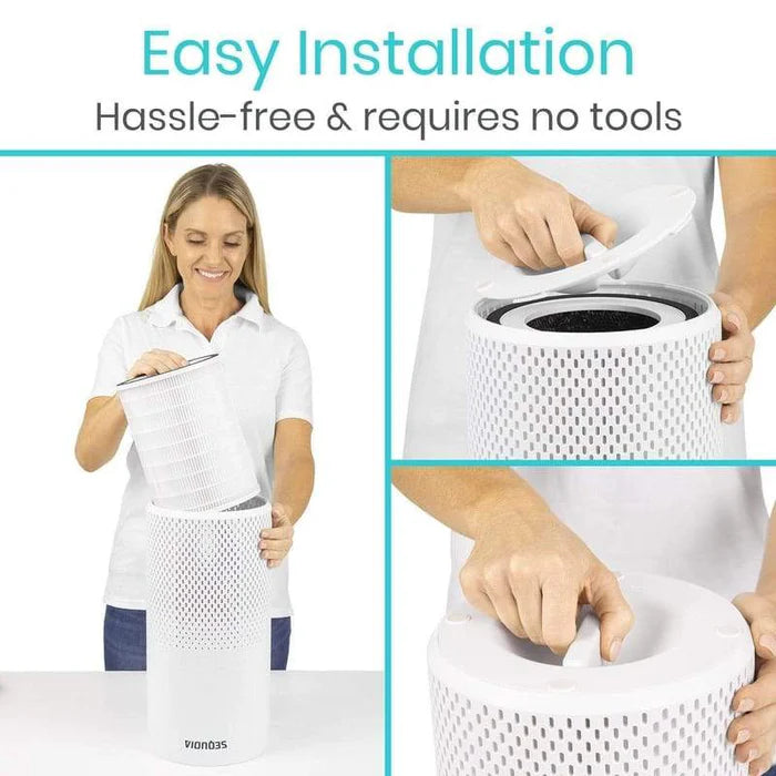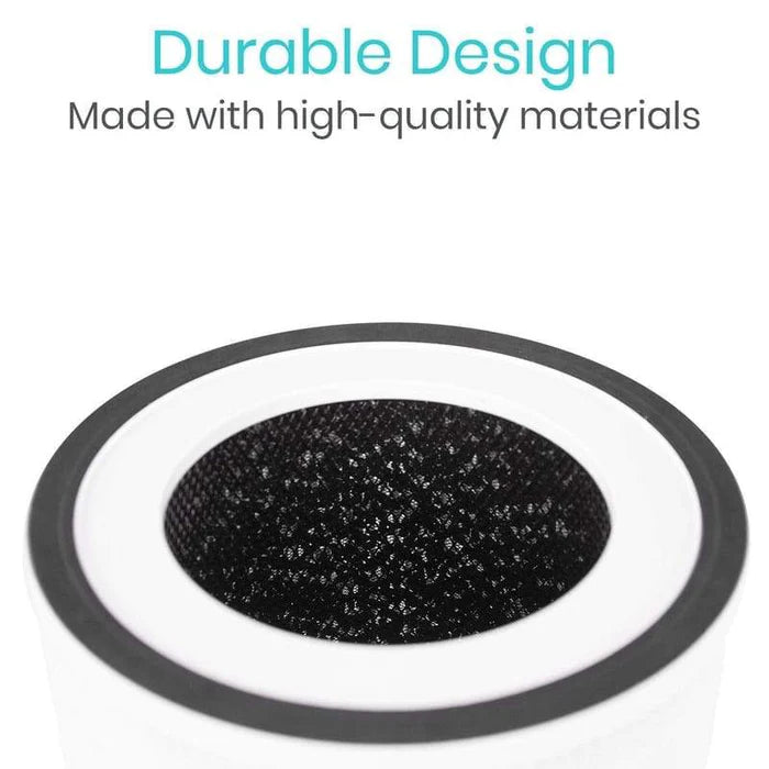The Vive replacement air filter measures 8.56” in height and 6.44” in diameter.