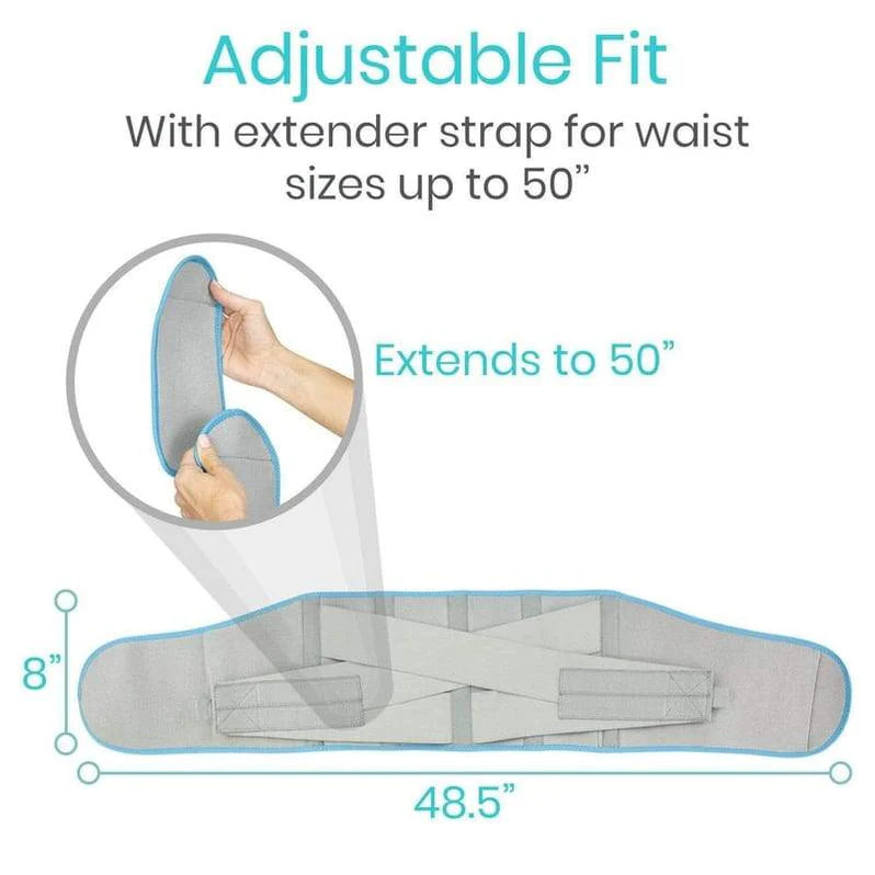 The Vive back ice wrap will fit waist circumferences up to 42”. When used with the included 8” extender strap, the wrap will accommodate waist sizes up to 50”.