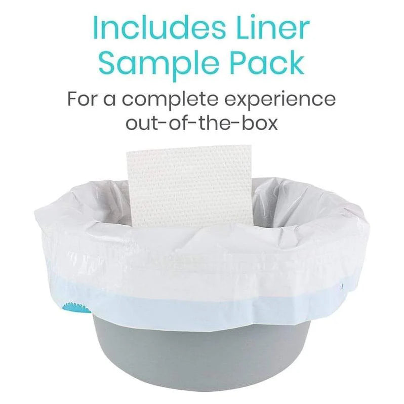 Six-quart commode pail fits standard commode liners and also includes a lid and splash guard