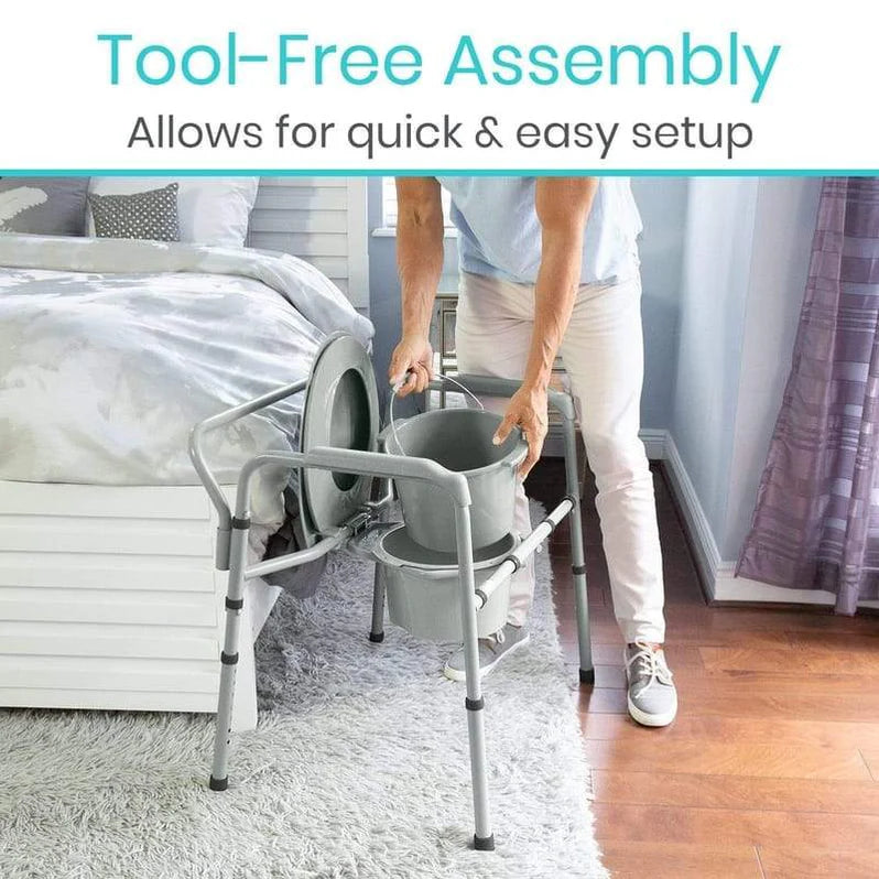 Initial setup is quick and easy, simply insert the legs to the desired height, set the pail in the frame and place the commode in the desired location