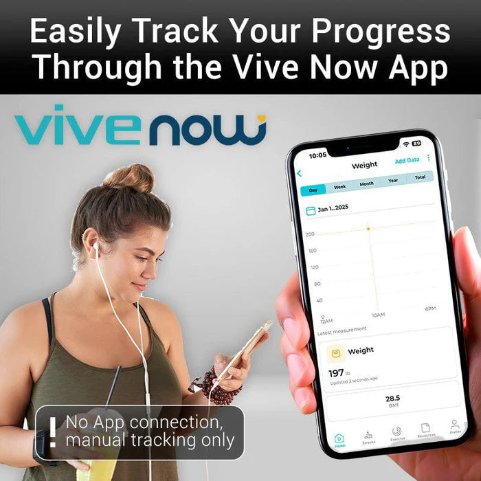 Designed for precise and reliable readings, this scale helps ensure consistent and easy health tracking. Easily log your weight manually using our Vive Now App, and keep your results at your fingertips.