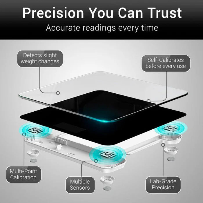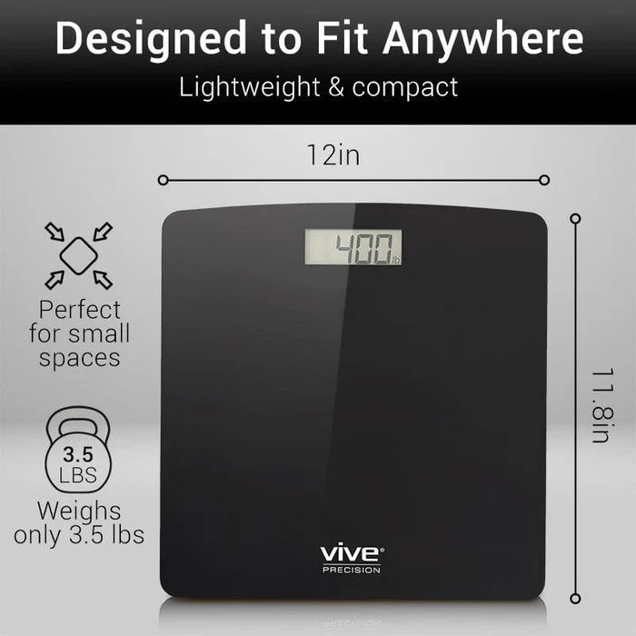 The Vive Precision Digital Scale is compact and space-saving, measuring 12.09” x 11.81” (30.7 x 30 cm), making it ideal for small bathrooms and easy storage.