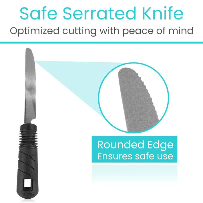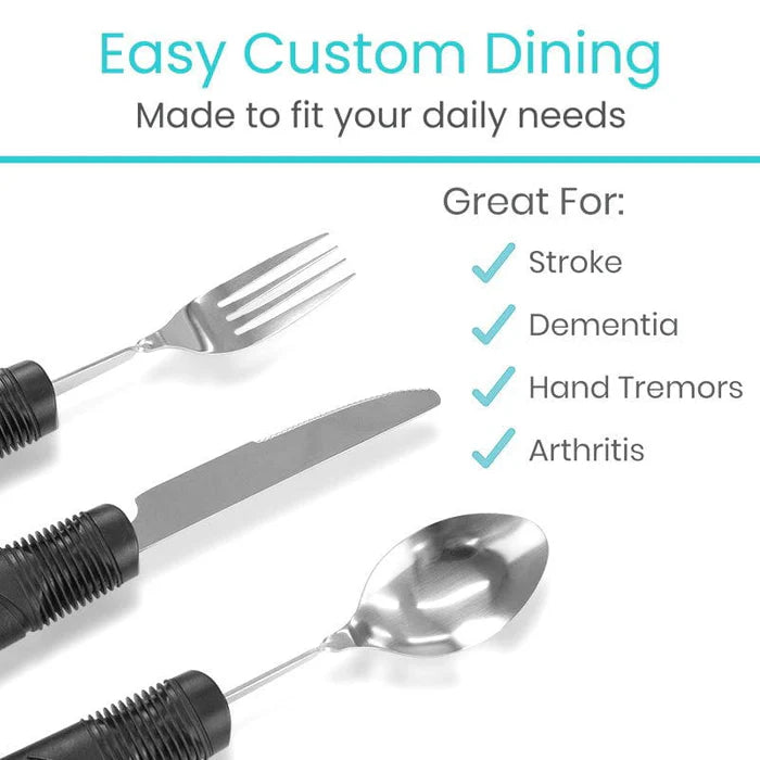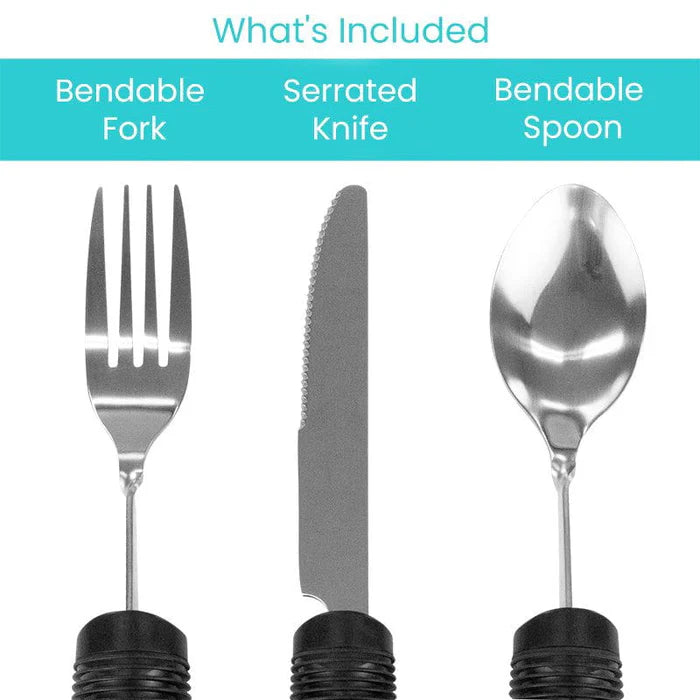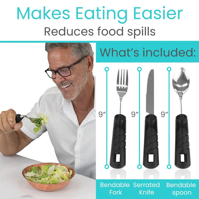 The Vive Bendable Adaptive Utensil Set includes a stainless steel knife, fork, and spoon, equipped with textured rubber handles for individuals who struggle to grip traditional silverware. Enjoy greater independence while dining with this complete flatware set.