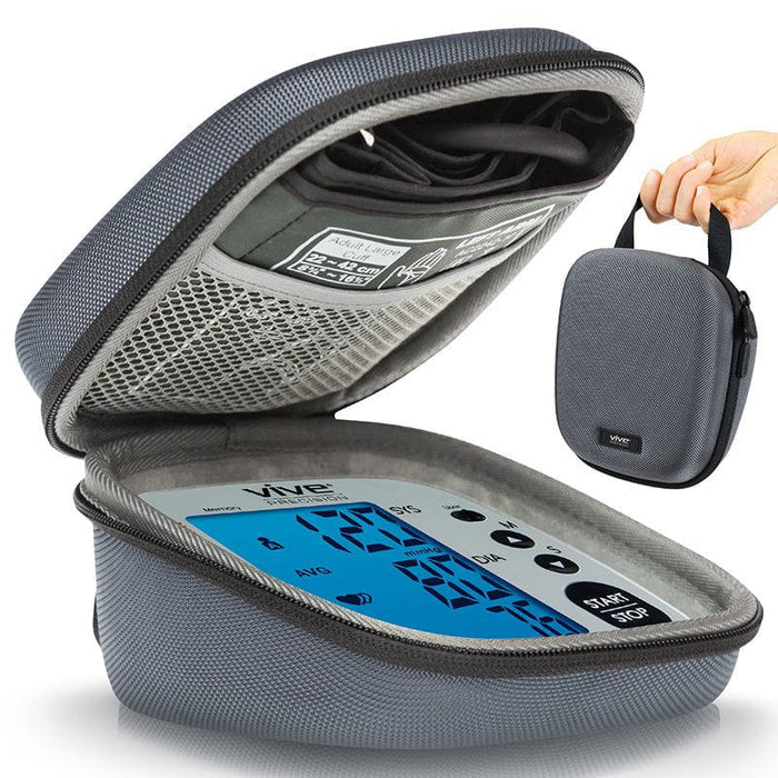Stores and protects a blood pressure monitor, blood pressure cuff and power adapter