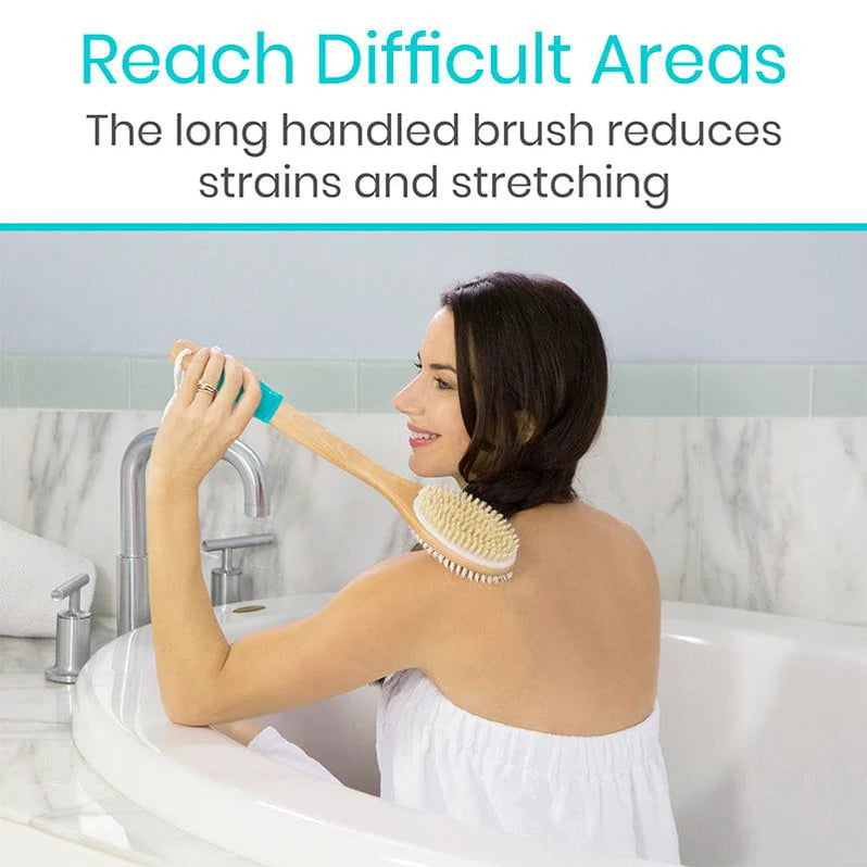 Rubber textured grip on the extra length handle for safe grasp in the shower