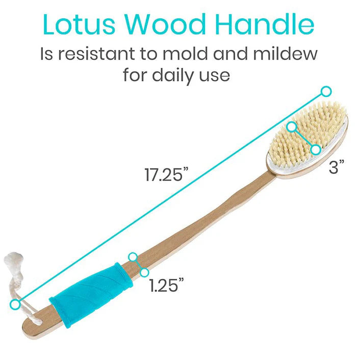 Rubber textured grip on the extra length handle for safe grasp in the shower