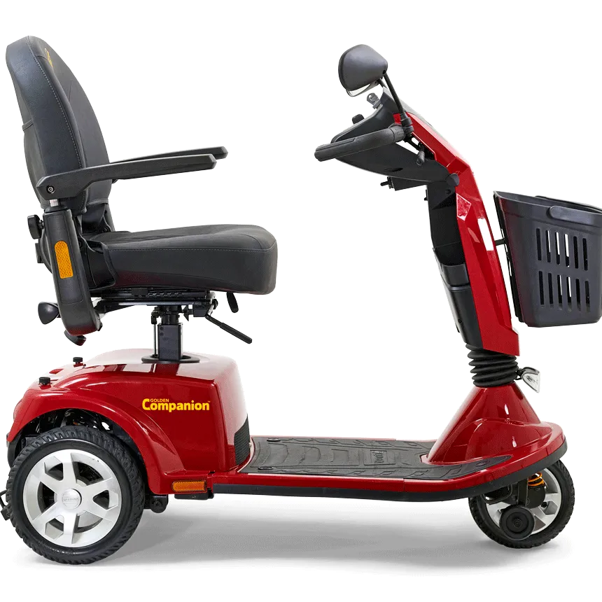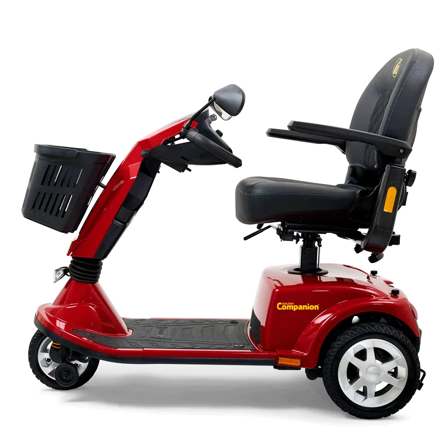 The Golden Companion full-size three-wheel scooter provides more legroom and a wider front deck compared to mid-size models. With an increased weight capacity of 400 lbs and operating range of 12 miles per charge (expandable to 19 miles with optional battery), this scooter offers exceptional value for users requiring extra space and extended mobility.