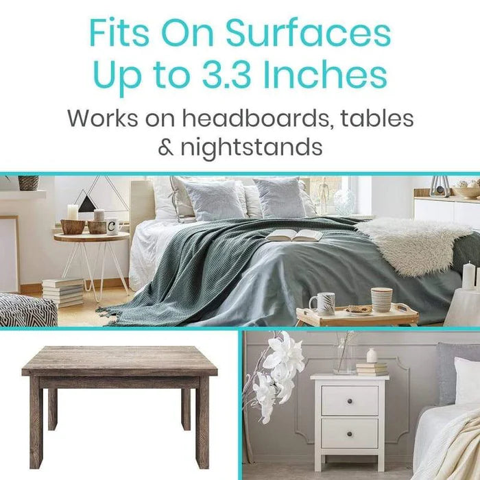 The mounting clamp of the Vive CPAP hose holder may be attached to a nightstand, side table, headboard or rail.
