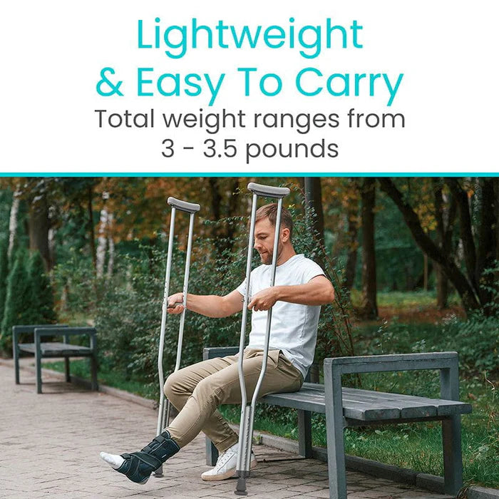 Continue to stay in motion while recuperating from an injury or surgery with the Vive Crutches. With a sleek and strong aluminum frame and padded support for your underarms and hands, these crutches provide reliable and sleek mobility assistance. These crutches are ideal for those with broken or sprained ankles, feet, or knees, as well as those who are recovering from surgery