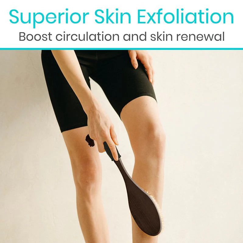 Creating an at-home spa experience, use the Vive Lotus Wood Body Brush Set to exfoliate and cleanse the skin, removing dead skin cells, improving circulation and lymphatic drainage