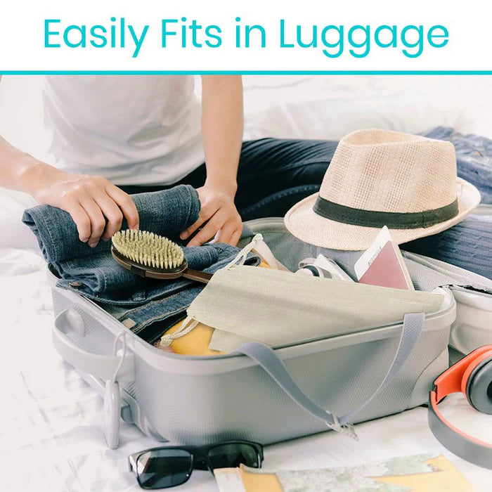 Hang your body brush in or out of the shower with the included adhesive hook or store the entire set in the cloth carry bag for easy storage or travel
