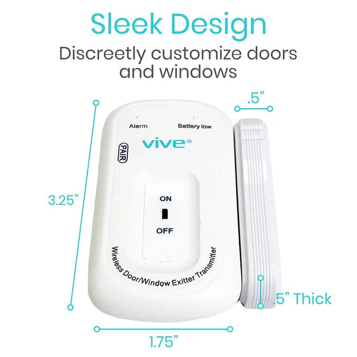The Vive door and window alarm measures 3.25” by 1.75” by 0.5” for use with any window or door.