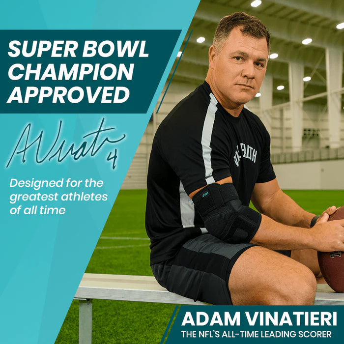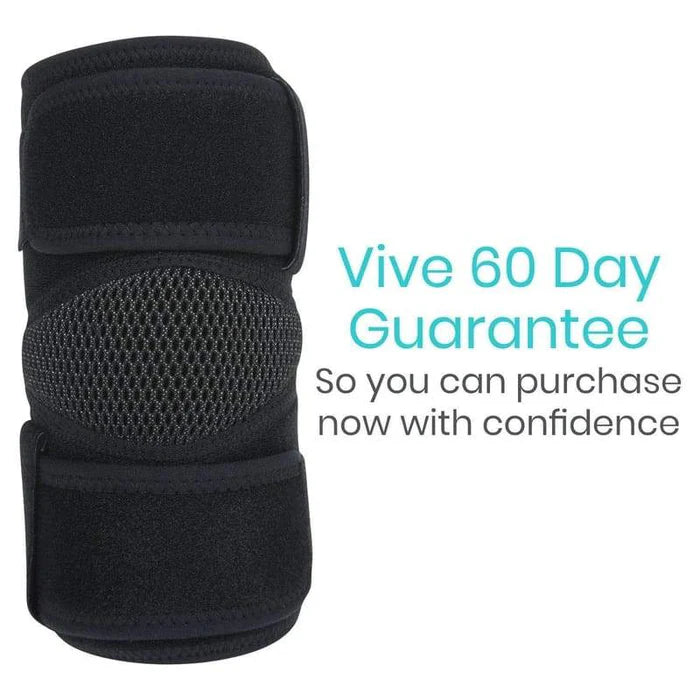 First, unfasten the straps and loosen the brace wide enough to easily accommodate the width of the desired arm. Insert your arm completely through the brace, and position it comfortably so that the point of your elbow is centered behind the padded portion and the Vive emblem is above your elbow. Pull the straps tight through the side loops, wrap them around the arm toward your body and secure them to the side of the brace.