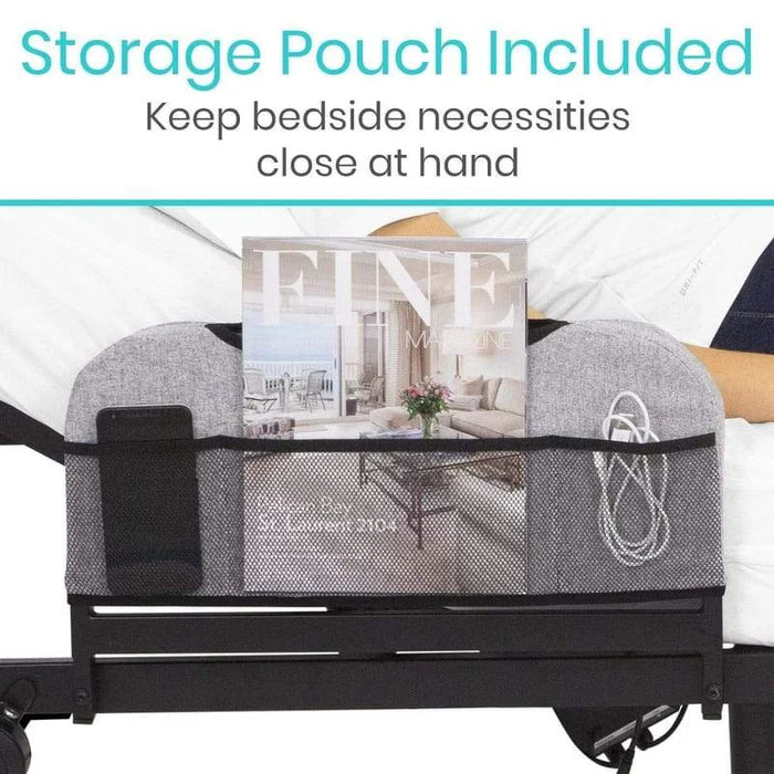 Includes a bed rail pouch with three mesh pockets as well as dual USB ports for conveniently powering electronic devices