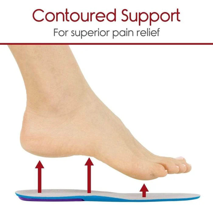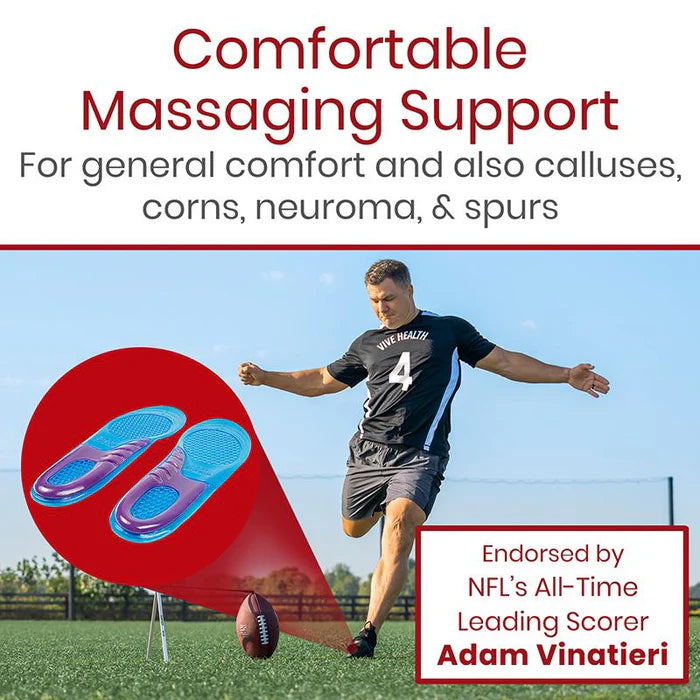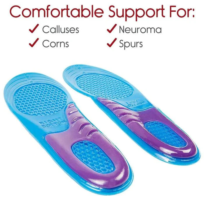 Massaging gel insoles relieves plantar fasciitis, arch and heel pain as well as reduces overall foot fatigue