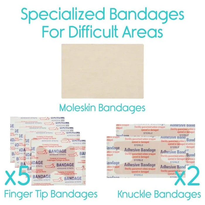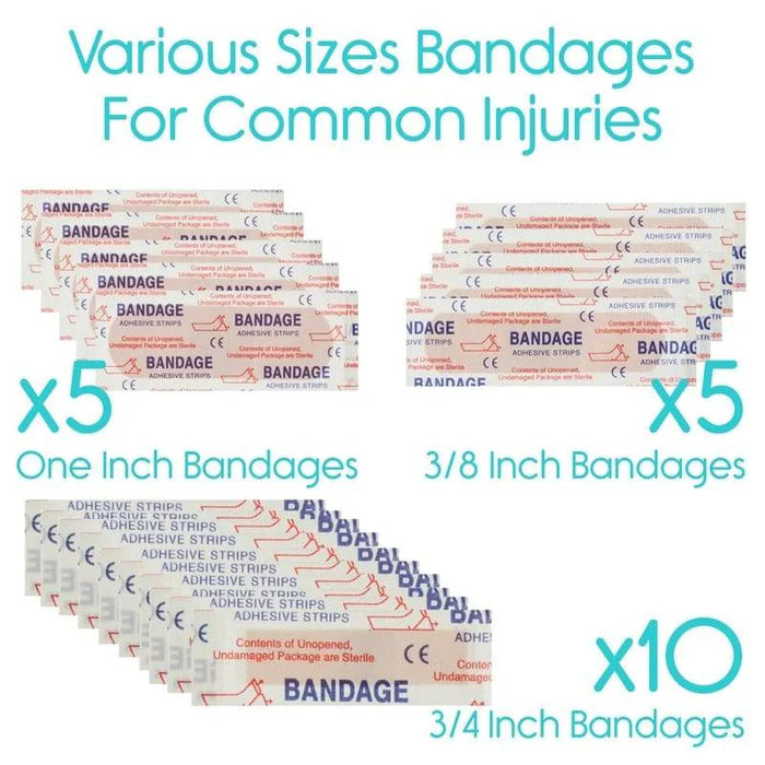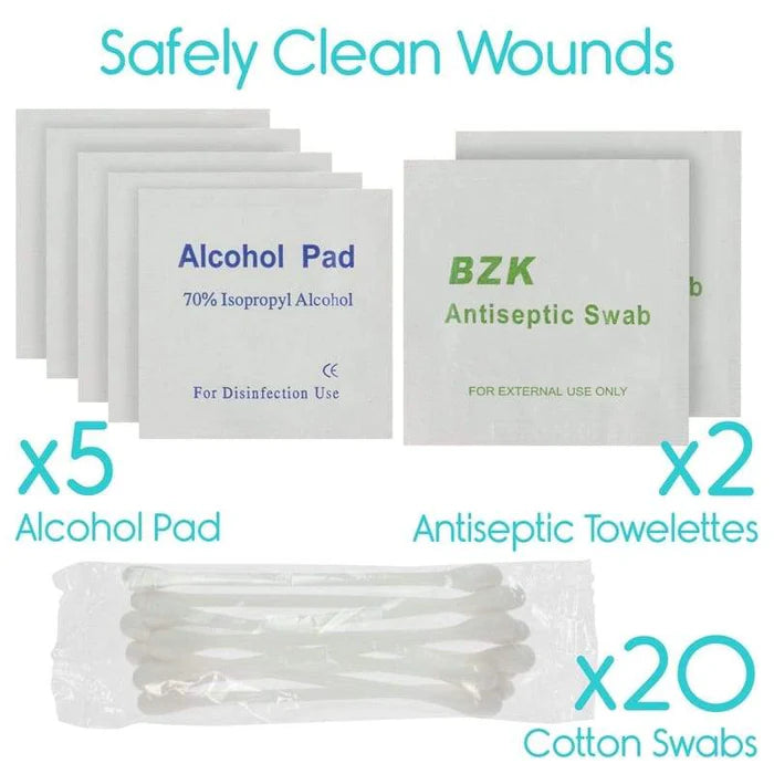 Comprehensive kit includes a variety of bandages, wound dressings, prep pads, swabs and more