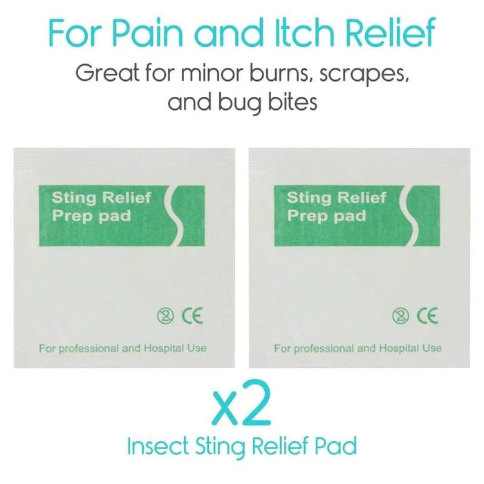 The kit includes 65 pieces for treating minor wounds, stings and bites. The contents include Alcohol pads, antiseptic towelettes, insect sting relief pads, three standard sizes of adhesive bandages, fingertip bandages, knuckle bandages, two sizes of gauze dressing pads, moleskin squares, cotton swabs, first aid tape, travel-sized scissors and a trifold storage case.