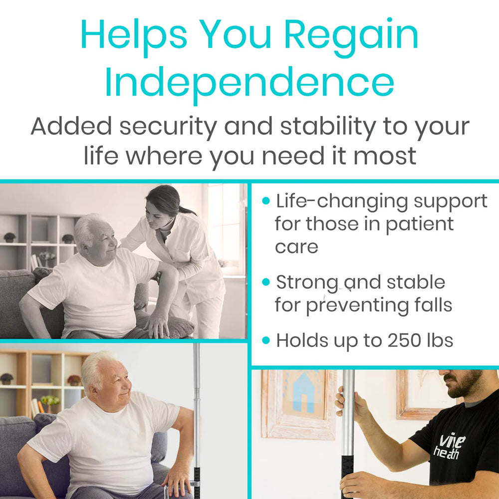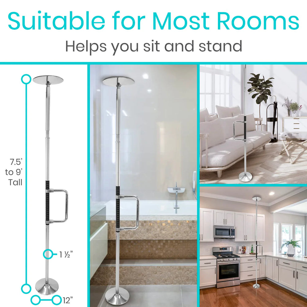 The Vive Floor to Ceiling Grab Bar can be used in living rooms, bedrooms, and bathrooms.
