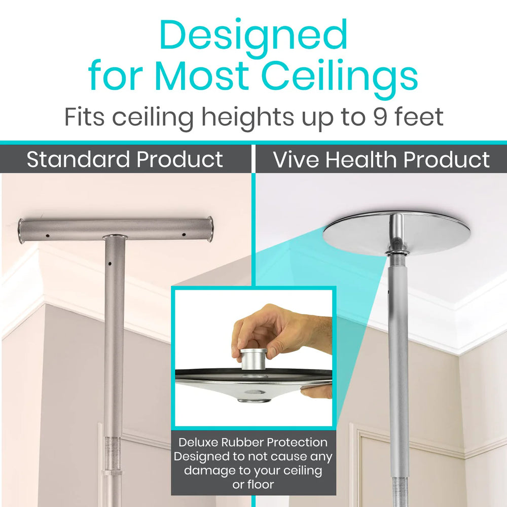 Adjust the height of the grab bar between 7’ 5” to 9’. The strong tension pole features 12” non-marking bases for safe use on any floor surface and flat ceiling type.