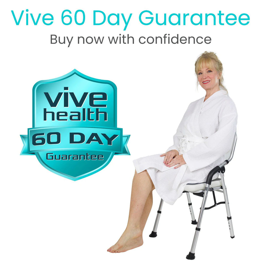 The Vive Folding Shower Chair comes with a 60-day guarantee, allowing you to purchase with confidence and ensuring satisfaction with the product's quality and performance.