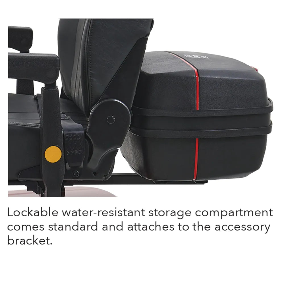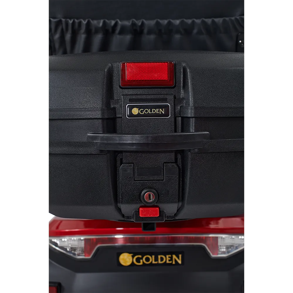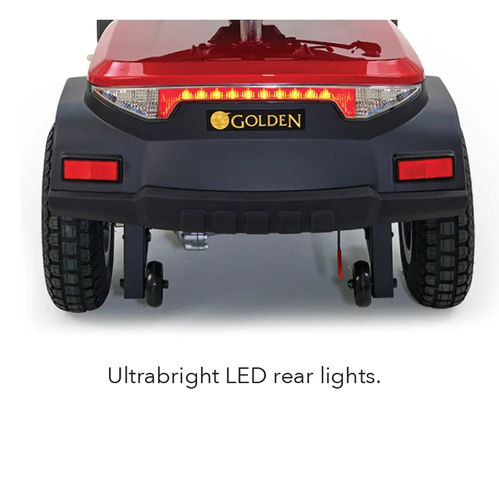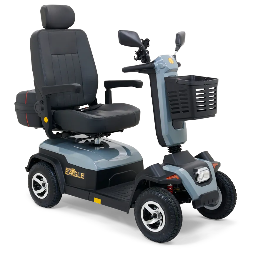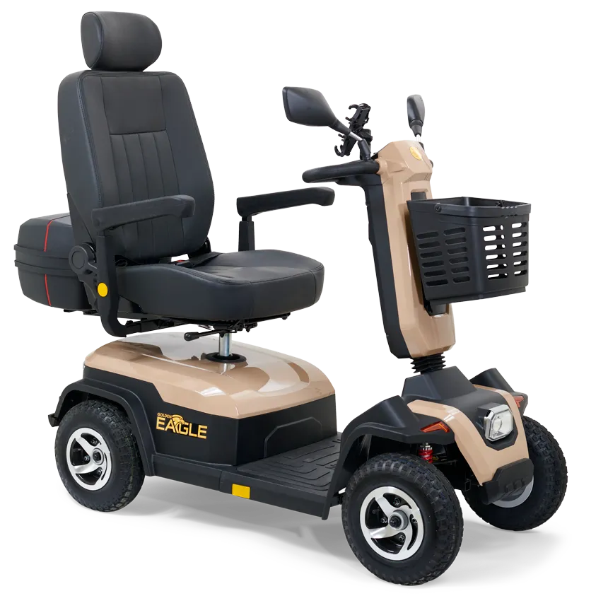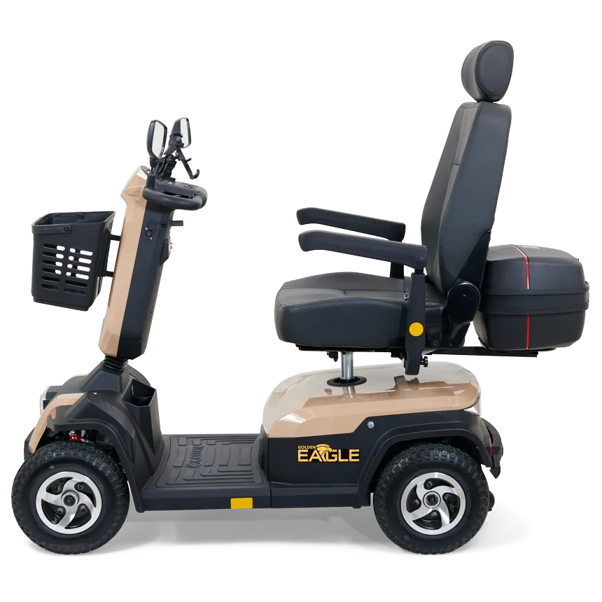 The Golden Technologies Eagle is a premium heavy-duty 4-wheel mobility scooter designed for outdoor recreational use. With an impressive 500 lbs weight capacity, up to 32-mile drive range, and 5-inch ground clearance, this full-size scooter tackles hills and bumpy terrain with ease. Features include front and rear suspension, built-in Bluetooth speaker, USB connectivity, and a water-resistant locking rear storage box.
