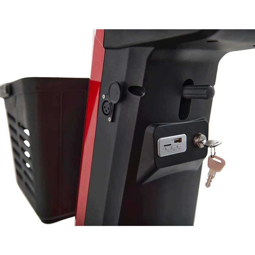 Safety features include rear regenerative braking with an electronic park brake for secure stops and parking. The water-resistant locking rear storage box and large front basket provide ample space for personal belongings. For space-saving storage, the seat and tiller fold together when not in use.