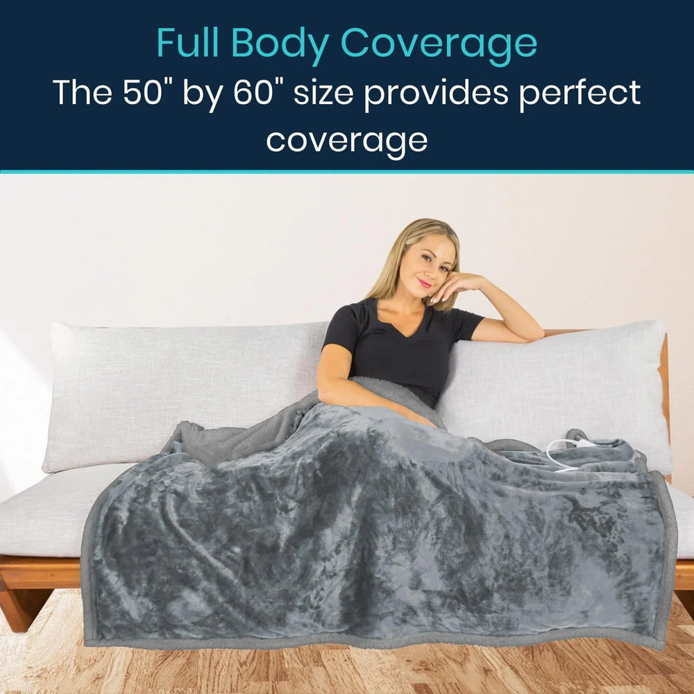 The Vive heated blanket measures 50” by 60” for comfortable coverage.