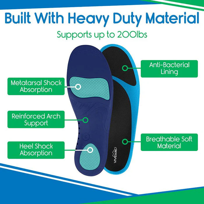 Alleviating foot and back pain and fatigue, our ViveSole Heavy Duty Gel Insoles provide stabilizing support and cushioning for all-day comfort