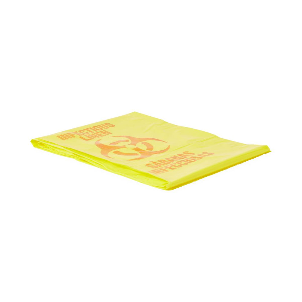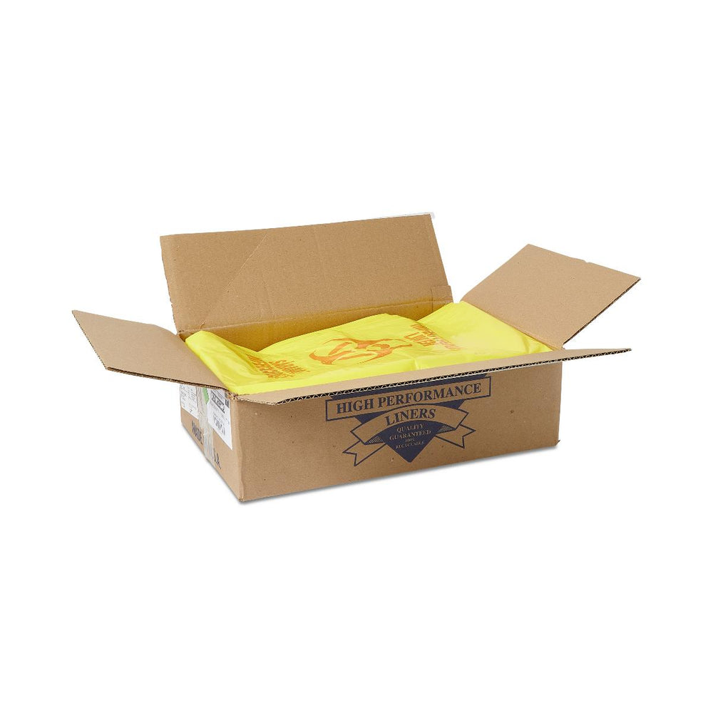 Each liner features prominently displayed color-coded biohazard symbols that enable instant visual identification and proper segregation of infectious materials from regular waste streams. The bright yellow polyethylene construction meets industry standards for infectious waste containment, while the bilingual markings (English/Spanish) ensure clear communication across diverse healthcare teams, facilitating proper handling protocols and reducing the risk of cross-contamination or accidental exposure to hazardous materials.