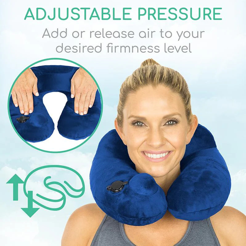 The neck pillow is adjustable by inflating or deflating for personalized comfort.