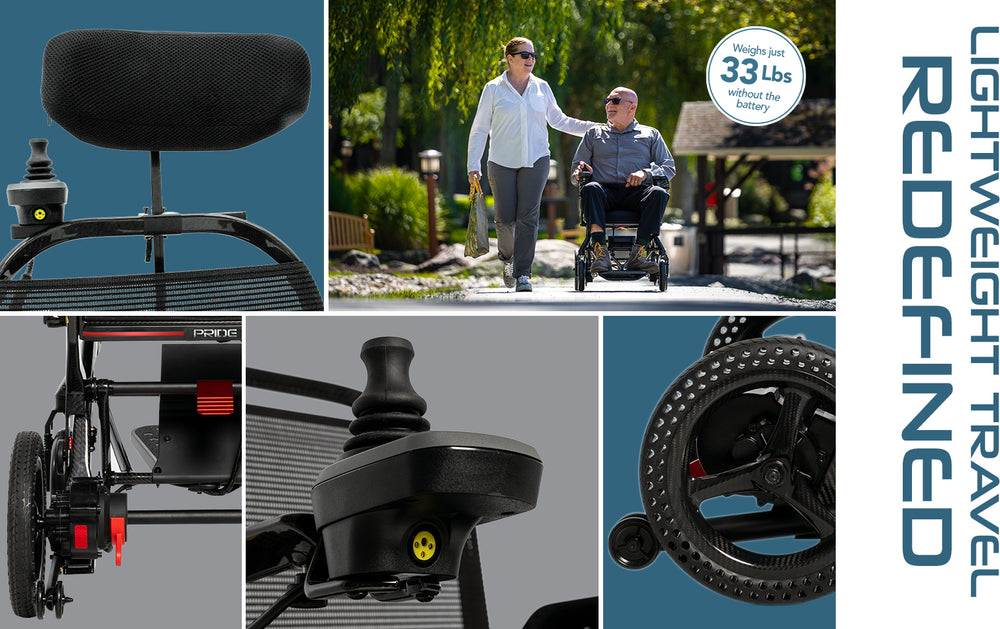 Jazzy® keeps getting lighter! The Jazzy Ultra Light power wheelchair weighs a remarkable 33 pounds without the battery and folds nearly flat in a matter of seconds. With an all-carbon fiber frame, it’s lightweight and durable to assist you on all your travels.