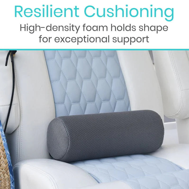 The lumbar roll is constructed with a high-density, polyurethane foam, a mesh fabric blend and elastic.