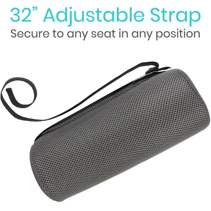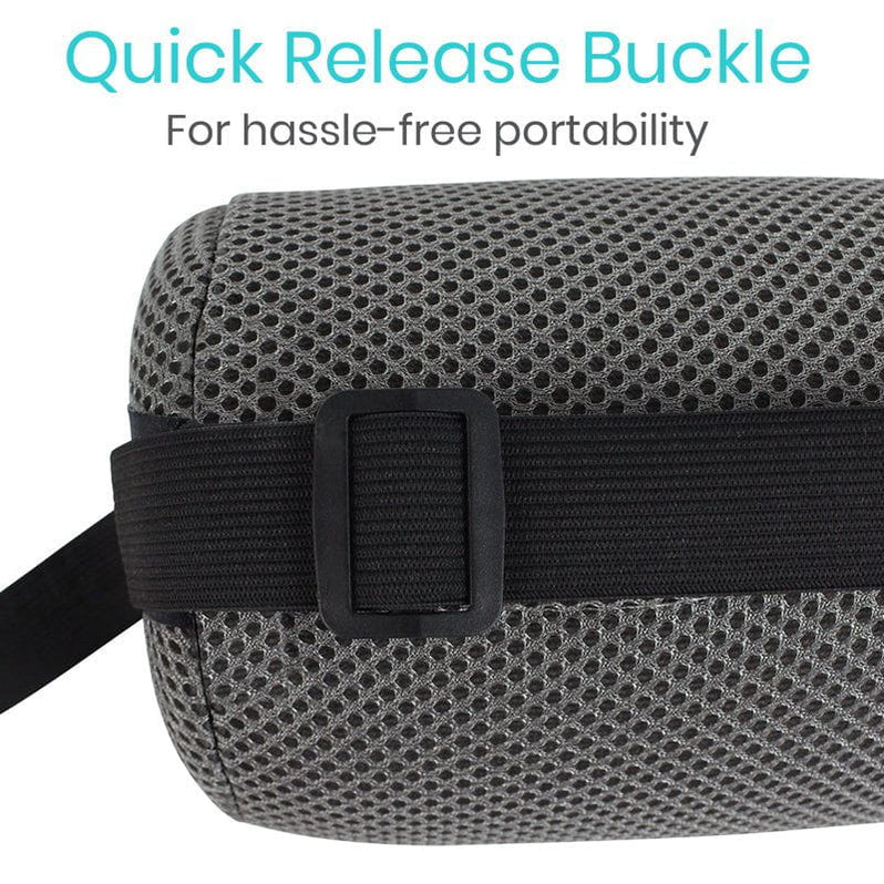 Integrated elastic strap secures the lumbar roll to any seat, including office chairs, car seats or airline seats
