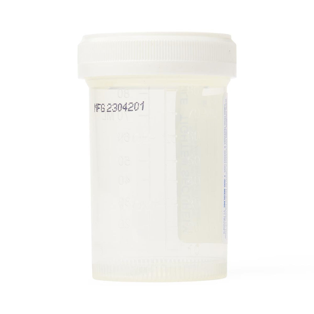 Specifications at a Glance: 120 mL (4 oz.) capacity | Transparent with white screw cap | Polypropylene construction | Sterile fluid path | Graduated measurements | Patient ID label included | Latex-free | Single-use disposable