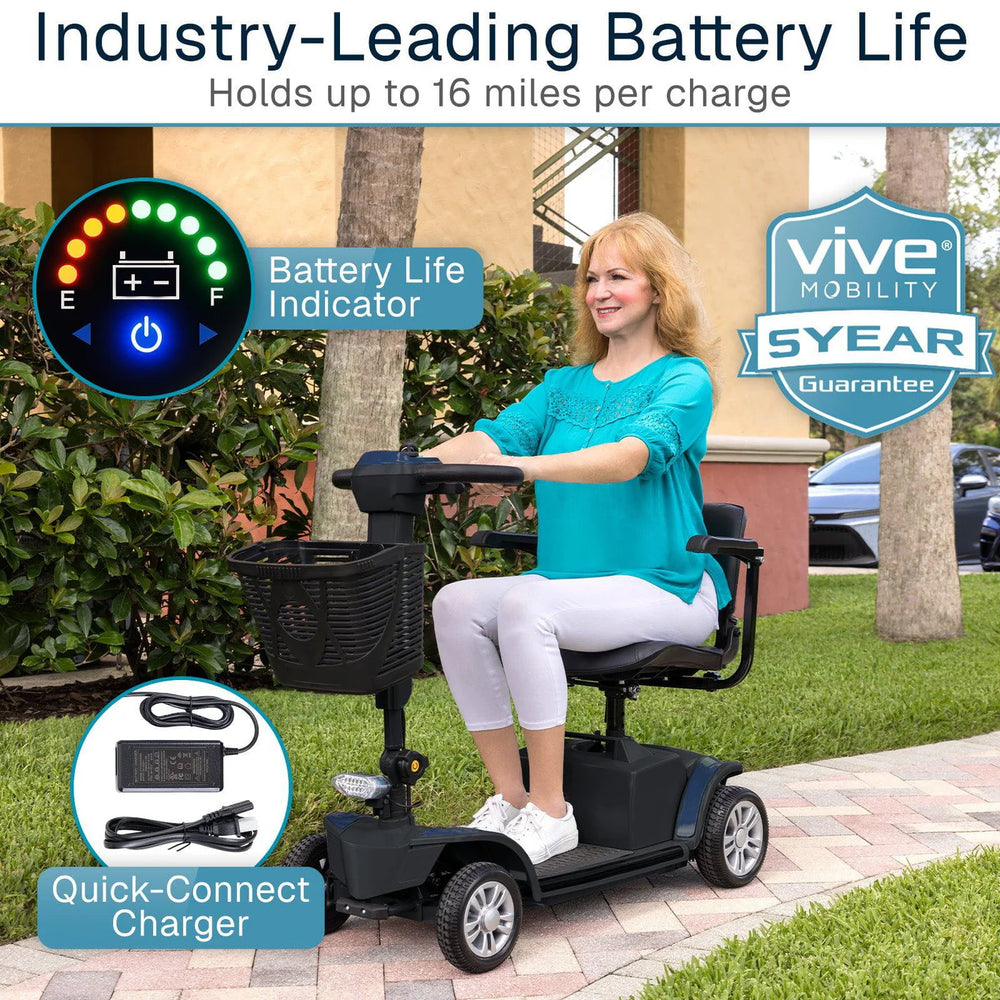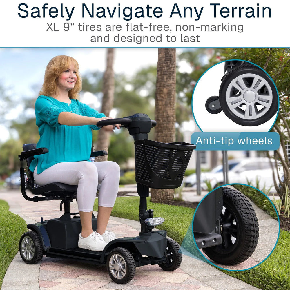 The Vive Neptune Mobility Scooter can travel up to 16 miles on a full charge, making it ideal for daily errands, appointments, and longer outings without worrying about running out of power.