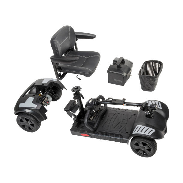 The Phoenix 4-wheel travel scooter combines a 350 lbs weight capacity with the take-apart portability of a travel scooter. The 4-wheel design and anti-tip wheels assist with overall stability for a more secure experience. This scooter also has a height-adjustable seat with flip-back and adjustable-width arms to accommodate varying body types. The seat also helps with portability by folding flat and allowing for easier transporting or storage. Your Phoenix 4-Wheel scooter can easily and quickly disassemble into five pieces.