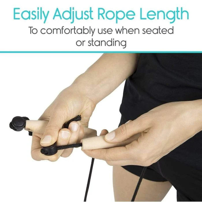 Continuous rope length is 74”’ and is easy to adjust with integrated button sliders to comfortably use while seated or standing