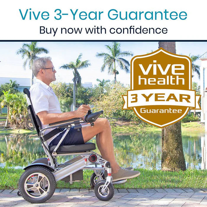 The Vive Mobility power wheelchair measures 38” by 25” when folded for travel or storage.
