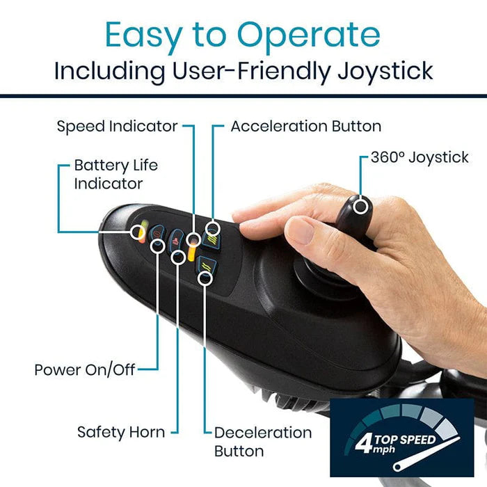 Repositionable, 360-degree joystick controller + includes battery charge indicator, horn, & speed controls.