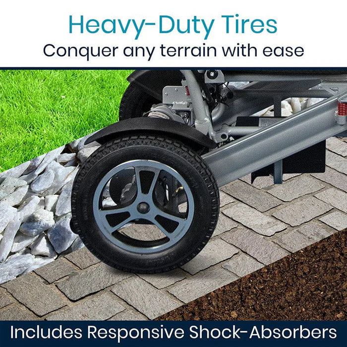 Featuring powerful dual motors, front shock absorbers, and tires to easily navigate over grass, gravel, pavement, carpeting & other hard surfaces