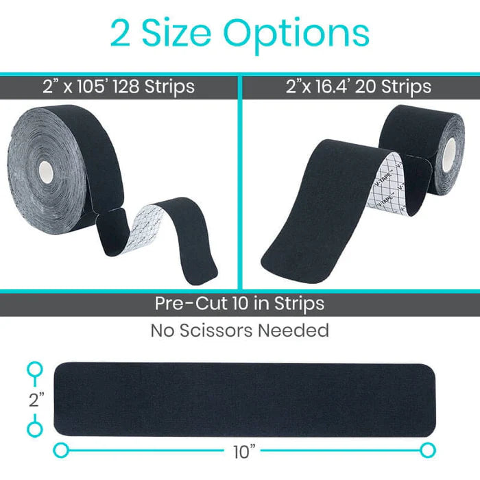 The Vive Kinesiology Tape is available in two lengths made of 10” strips. The standard roll is 16.4’and the long roll is 105’.