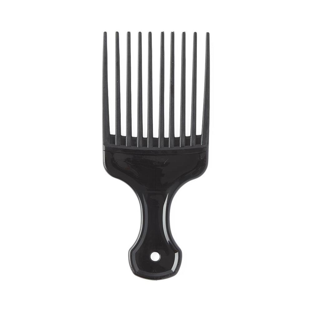 Crafted from high-quality, durable plastic material, this hair pick comb features precision-engineered teeth that glide smoothly through hair without snagging or pulling. The sleek black finish adds a professional touch to any styling station or personal grooming kit. At 5.125 inches in length and 2.25 inches in width, it's perfectly sized for comfortable handling and precise control during styling sessions.