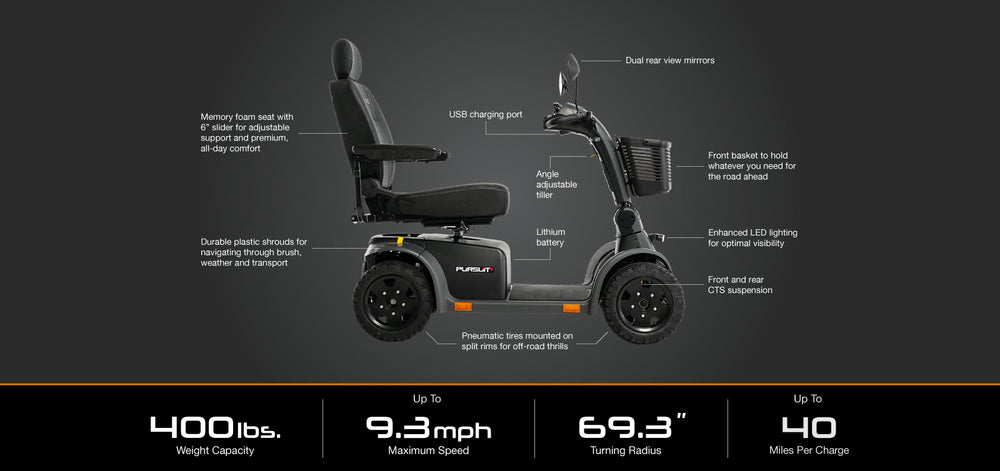 Built to thrill and designed to go the distance, the Pursuit 2 never backs down from an off-road detour or long-distance excursion. With a fast top cruising speed of 9.3 mph and the ability to make it 40 miles on a single charge, this agile unit offers swift, efficient transport and endurance you can count on.