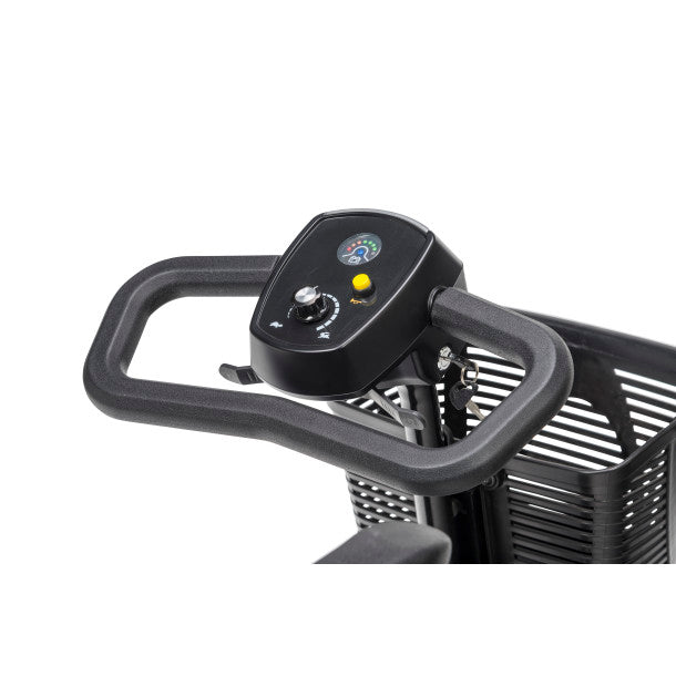 The Scout 4 Wheel comes standard with 12 AH batteries to offer up to 9 miles on a full charge. The Scout is a great travel scooter for those wanting a very lightweight scooter that can go the distance for a full day of activities. Your needs are sure to be met with all of the standard features on the Scout: a Delta Tiller for one-handed operation, adjustable armrests, a generously-sized front basket for storage of personal items, anti-tip wheels, and low-maintenance, flat-free tires.