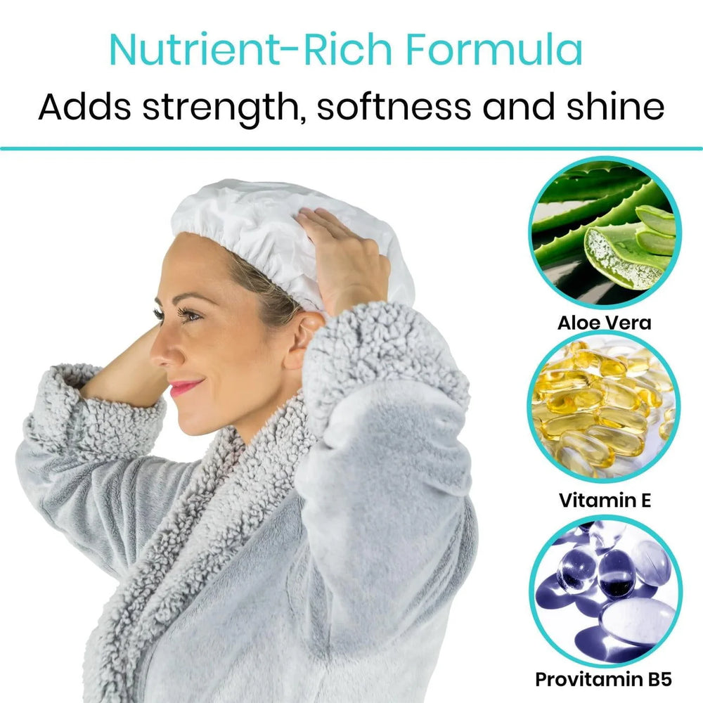 The Vive shampoo caps are formulated with aloe vera and vitamins lightly moisturizing the hair to promote a soft, clean feel.